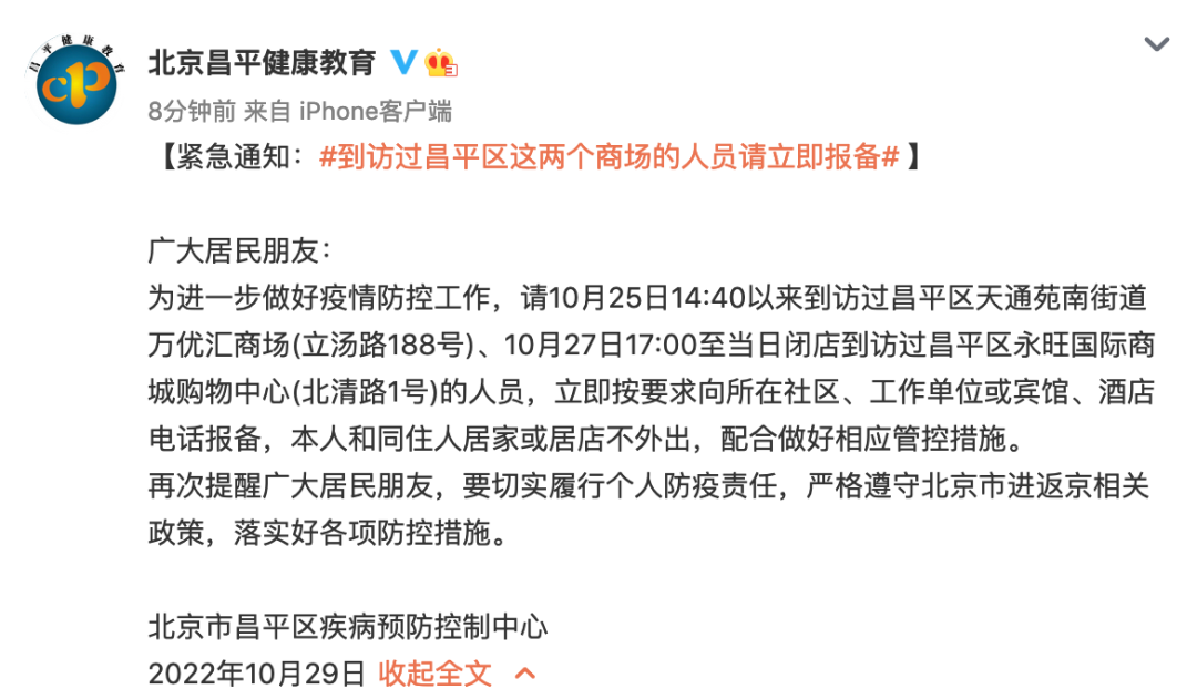 10月29日,北京市经济技术开发区疾控、昌平区、密云区疾控发布紧急报备通知。