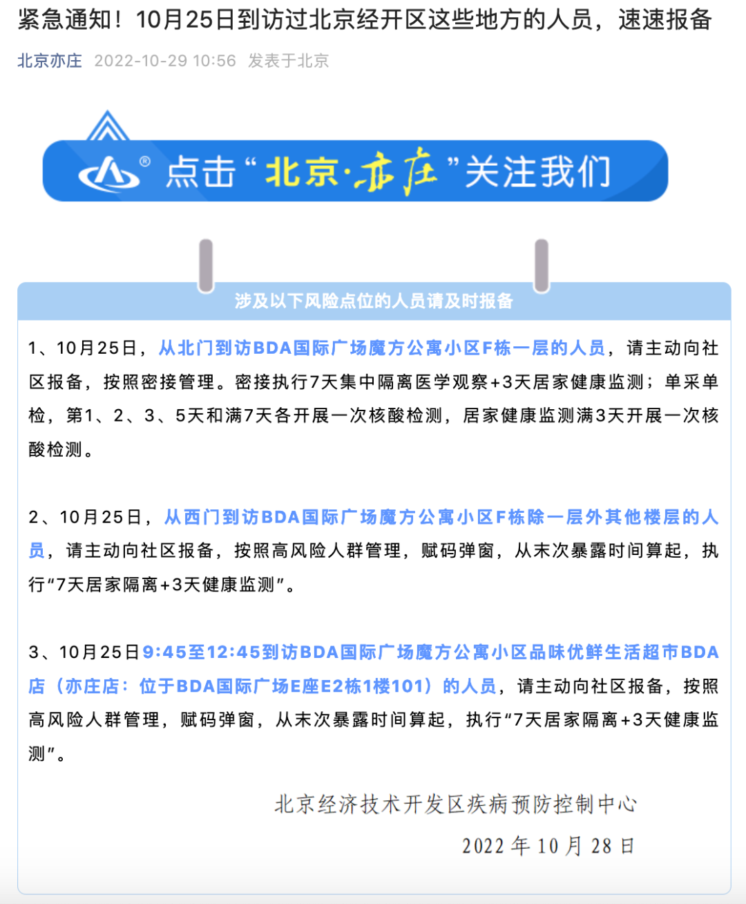 10月25日9:45至12:45到访BDA国际广场魔方公寓小区品味优鲜生活超市BDA店(亦庄店:位于BDA国际广场E座E2栋1楼101)的人员,请主动向社区报备,按照高风险人群管理,赋码弹窗,从末次暴露时间算起,执行“7天居家隔离+3天健康监测”。
