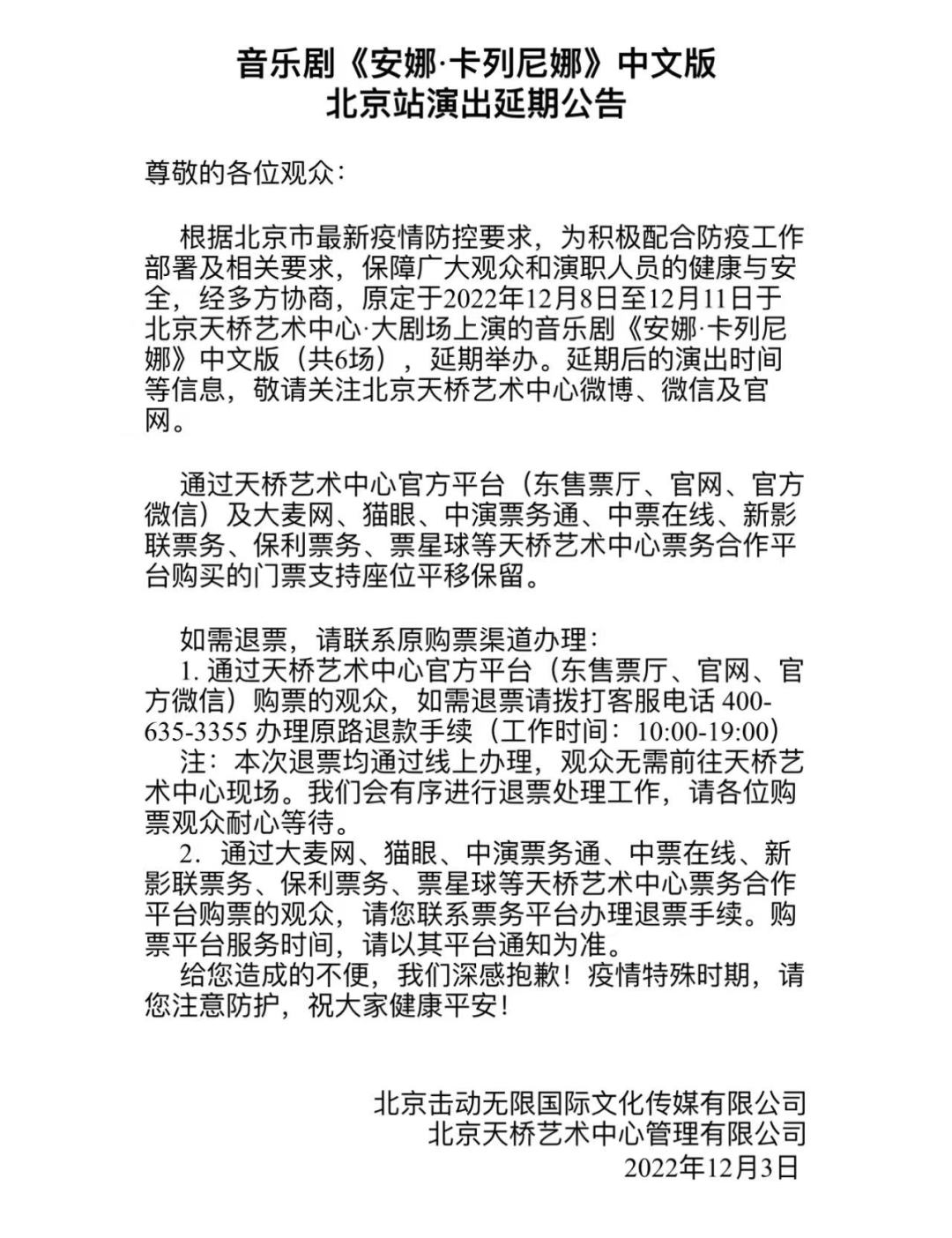根据北京市最新疫情防控要求,为积极配合防疫工作部署及相关要求,保障广大观众和演职人员的健康与安全,经多方协商,原定于2022年12月8日至12月11日于北京天桥艺术中心·大剧场上演的音乐剧《安娜·卡列尼娜》中文版(共6场),延期举办。