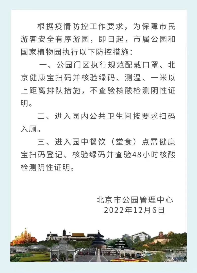 根据疫情防控工作要求,为保障市民游客安全有序游园,即日起,市属公园和国家植物园执行以下防控措施: