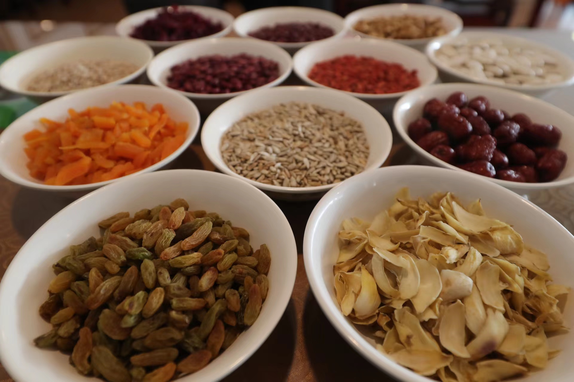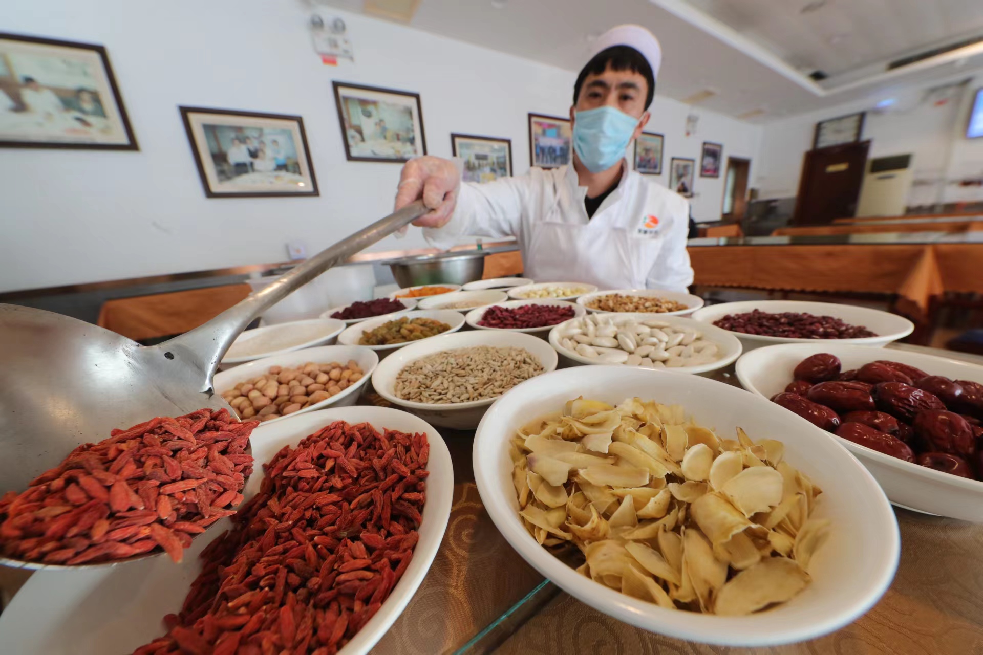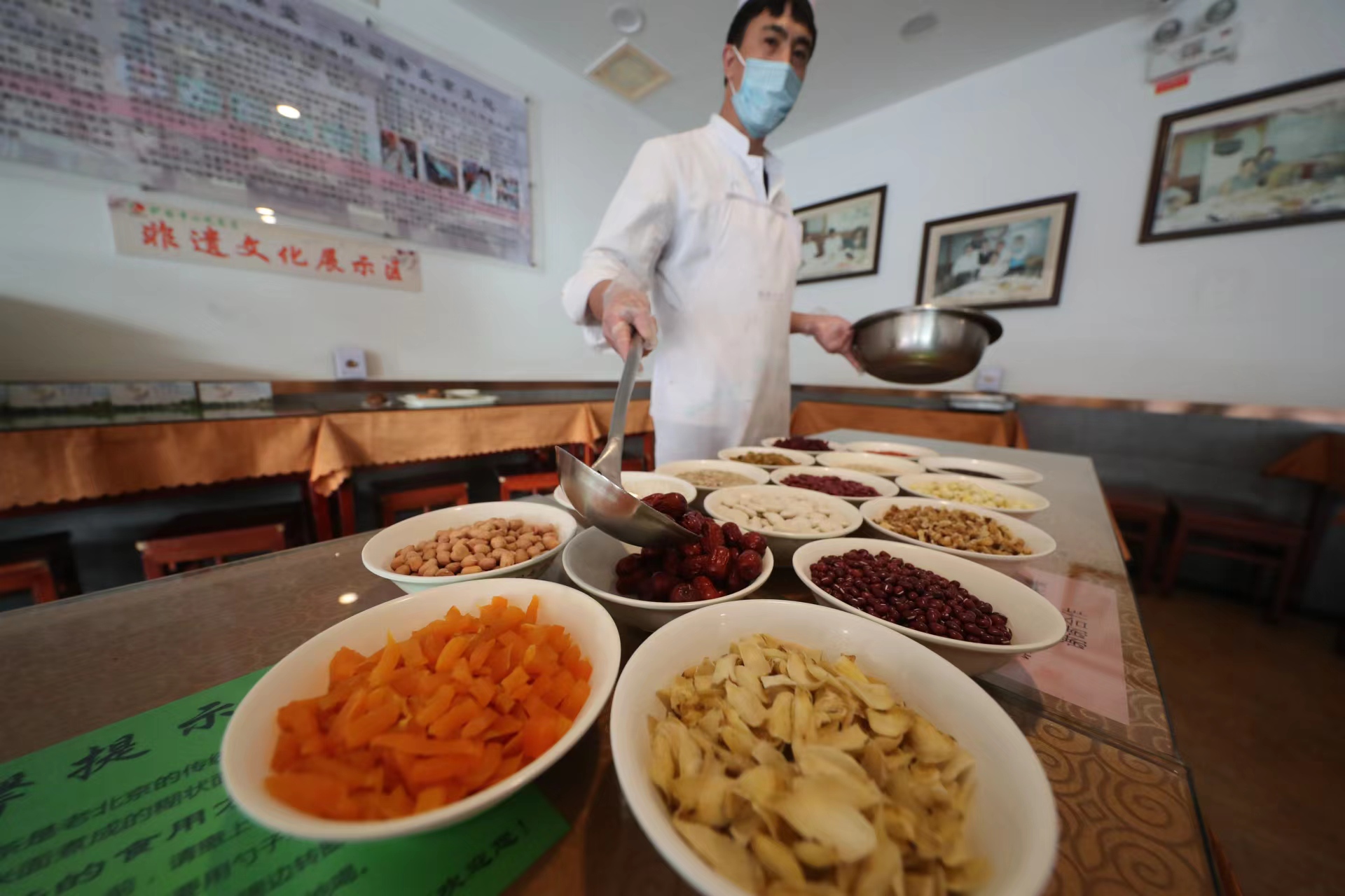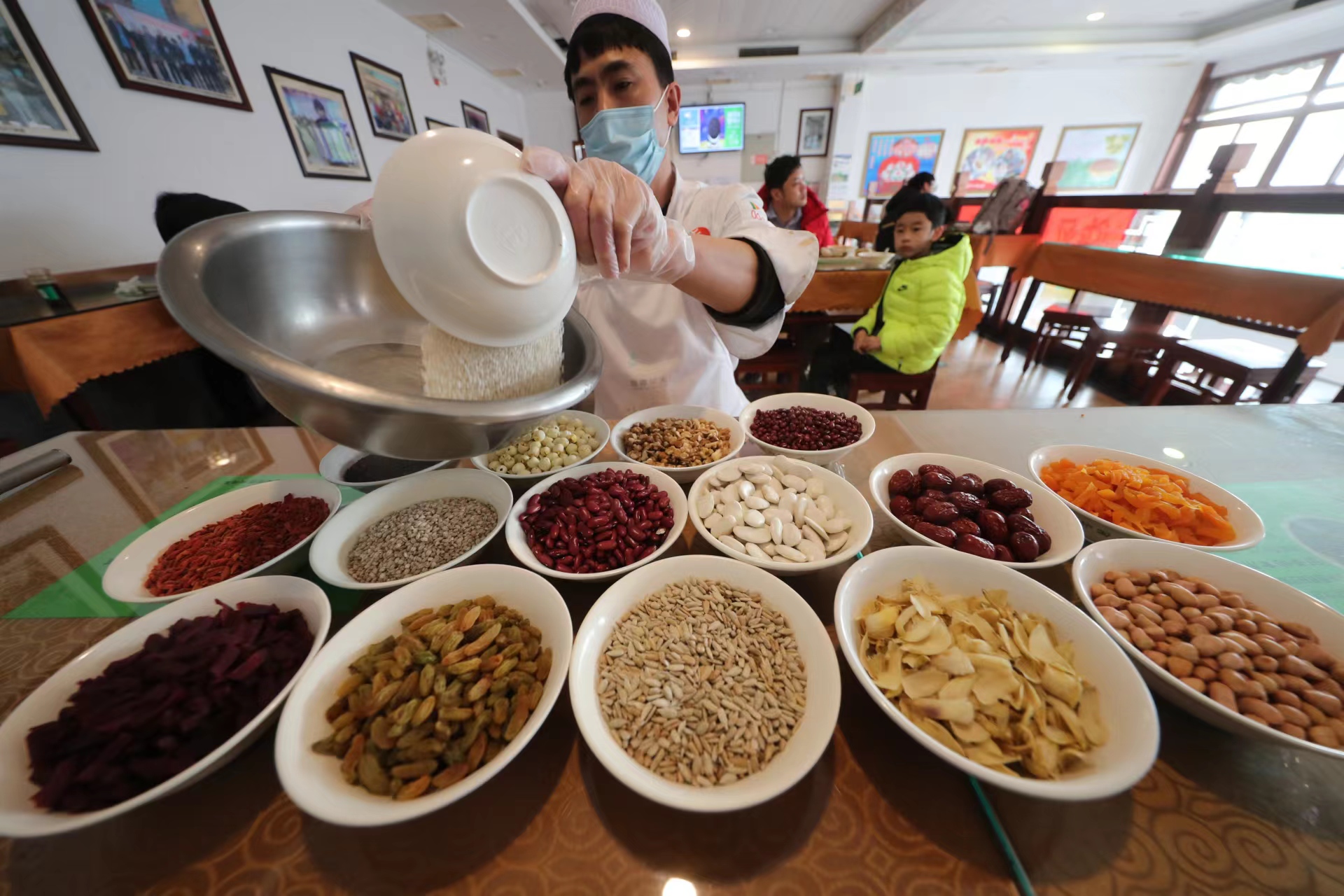 今年厨师对粥料进行了微调,将玉米渣、大麦米等原料加入其中。20种粥料包括白芸豆、红芸豆、红小豆、板栗、紫米、莲子、百合、核桃仁、红薯条、枸杞等。