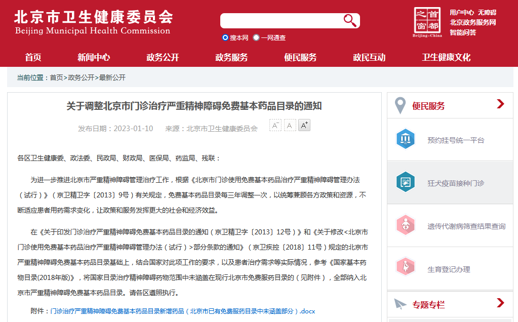 北京市卫生健康委员会网站发布《关于调整北京市门诊治疗严重精神障碍免费基本药品目录的通知》,氨磺必利、帕利哌酮、氟西汀等11种药品,进入免费目录。
