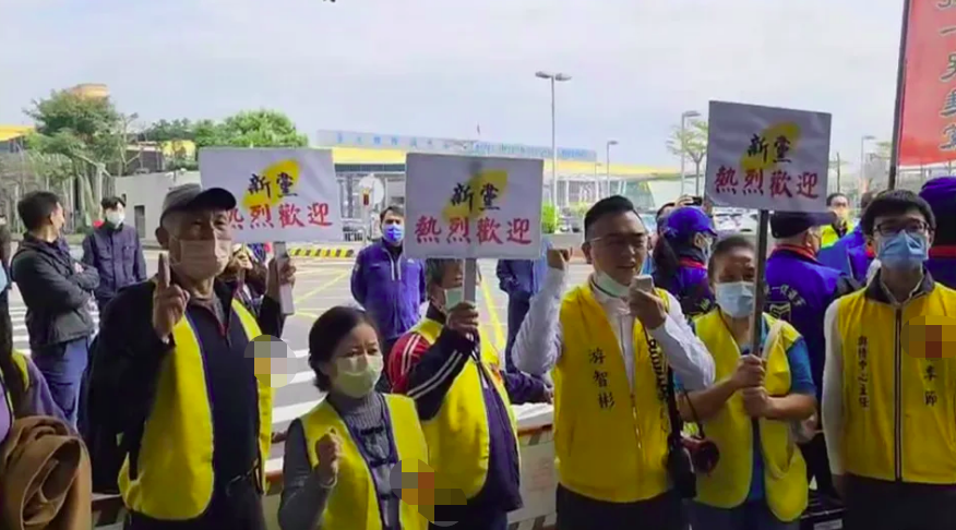 新党在举着“热烈欢迎”的牌子欢迎李骁东等人访台。图自台媒