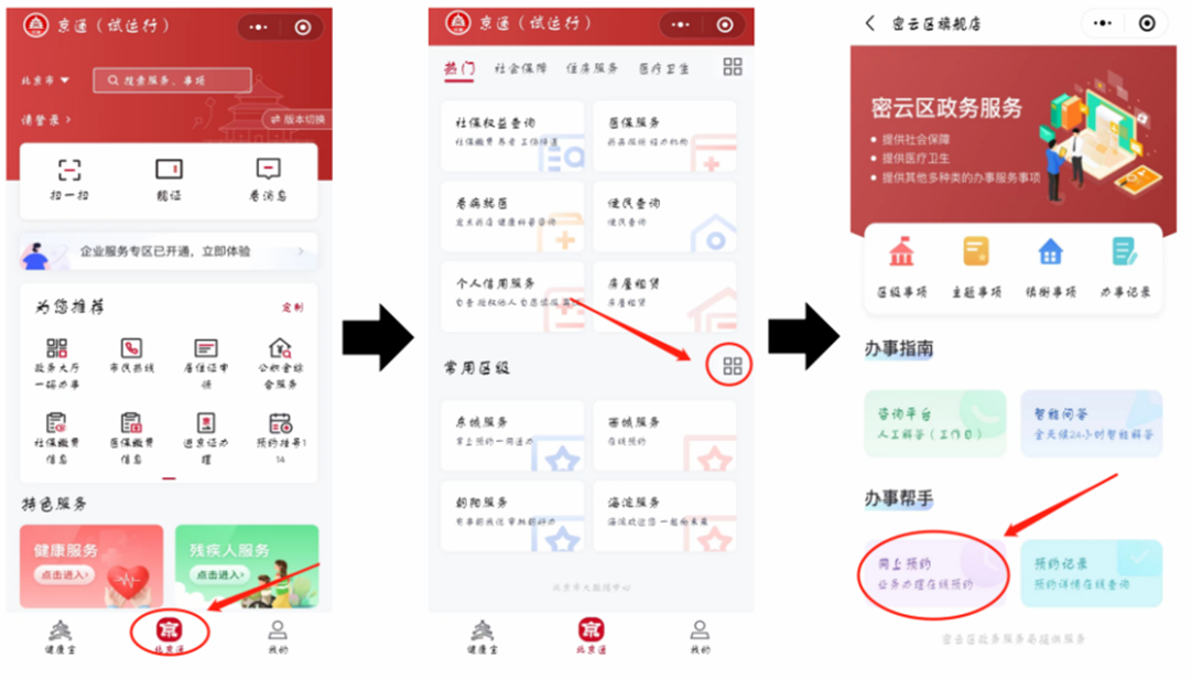 需要到密云区政务中心大厅办事的企业和群众可通过百度、支付宝、微信三端“京通”小程序进入密云区级旗舰店,即可进行网上预约。