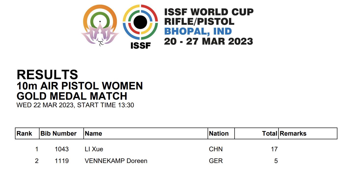 金牌赛采用“抢16”规则,两人进行单发对决,成绩高者得2分,低者不得分,打平各得1分。比赛中,李雪在中段表现稍有起伏,被文内坎普连追4分,好在此前她的领先优势较大。迅速调整状态的李雪连续打出10.5环和10.6环,以17比5赢下比赛,为中国队收获本站世界杯的首枚金牌。钱微获得该项目铜牌,卢恺曼位列第四。