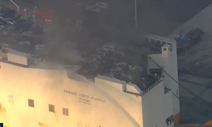 货轮起火。图源:美国福克斯新闻视频截图
