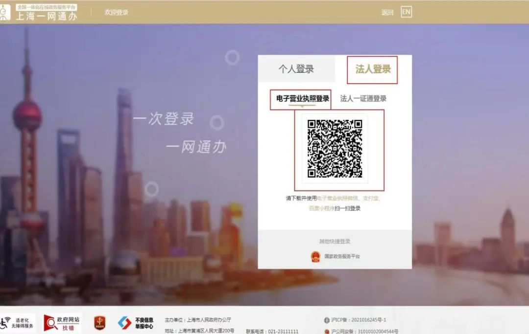 ①进入“上海一网通办”网址,通过电子营业执照或法人一证通登录系统。