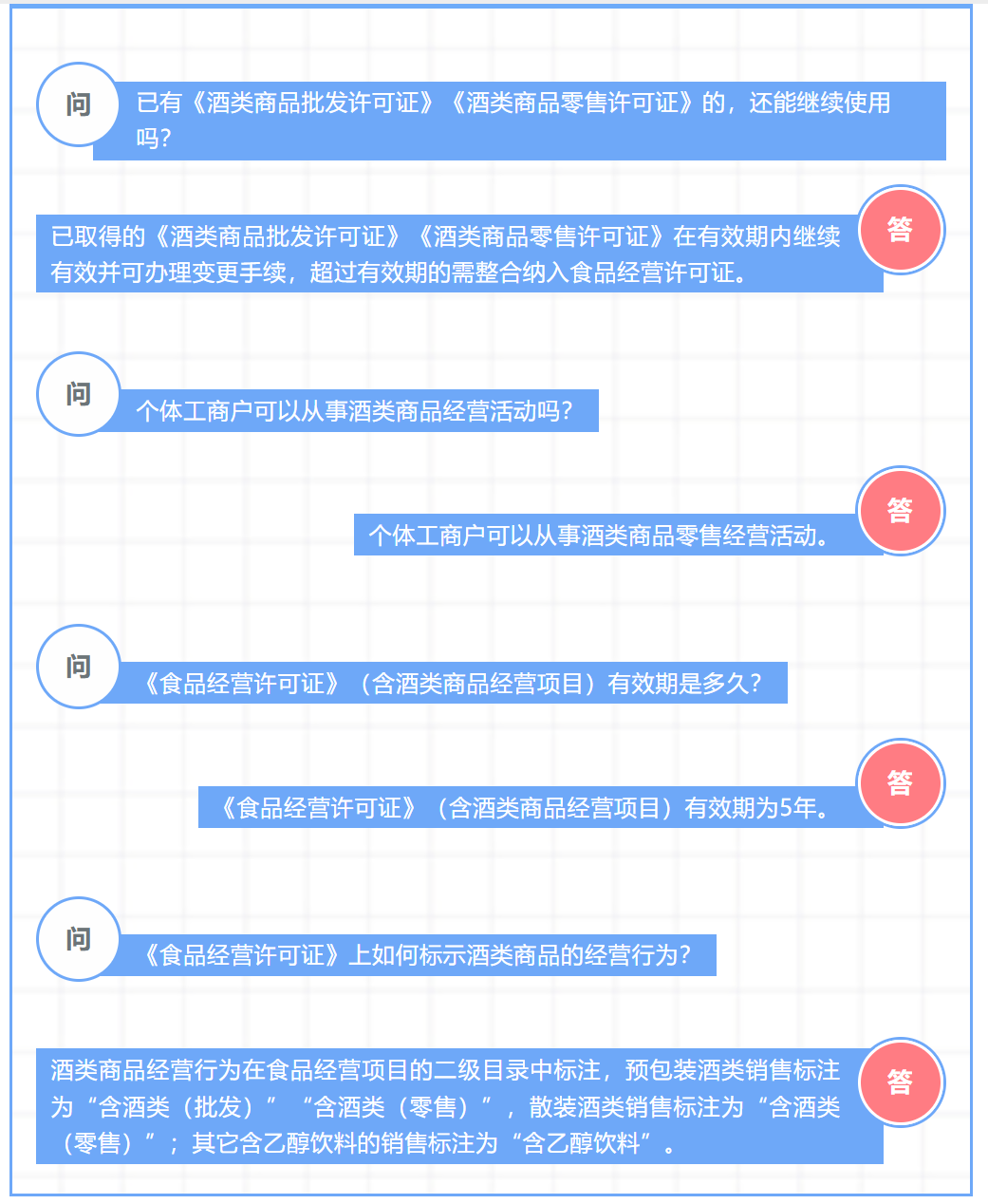 已取得《酒类商品批发许可证》《酒类商品零售许可证》的,在有效期内继续有效;有效期届满后,经营者继续从事酒类商品经营活动的,应当办理含酒类商品经营项目的食品经营许可。