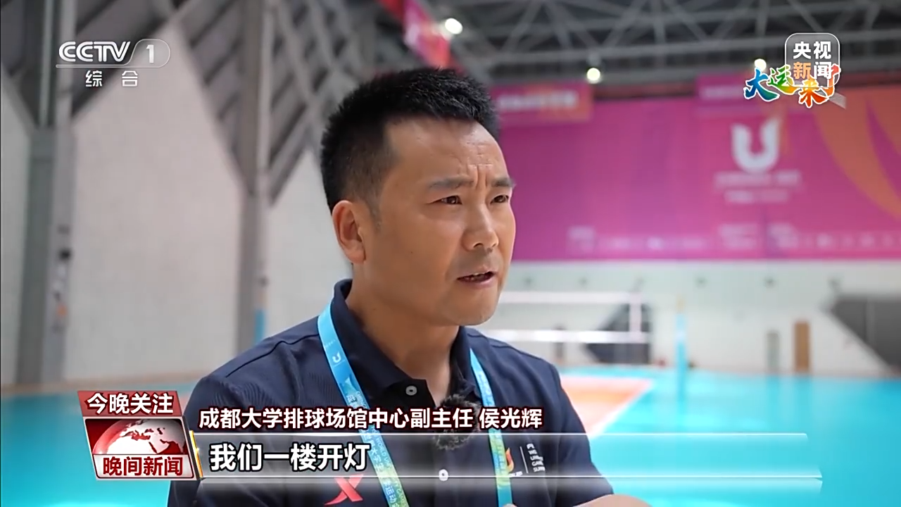 成都大学排球场馆中心副主任 侯光辉:我们一楼开灯,上面二楼、三楼我们都可不用开灯。每天我们可以节约大约300到500度电,相当于一个三口之家一个月的用电量。