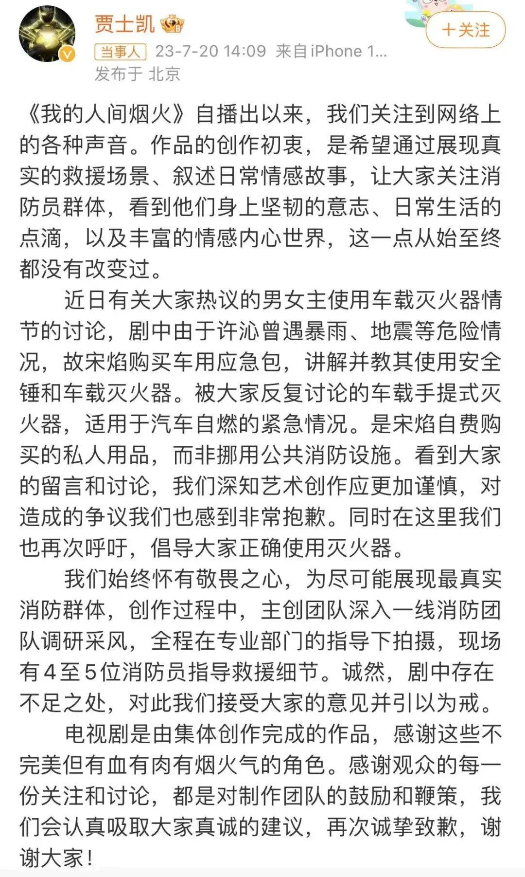 7月20日,《我的人间烟火》出品人贾士凯发文道歉,称该情节中使用的灭火器是男主角自费购买的私人用品,而非挪用公共消防设施。