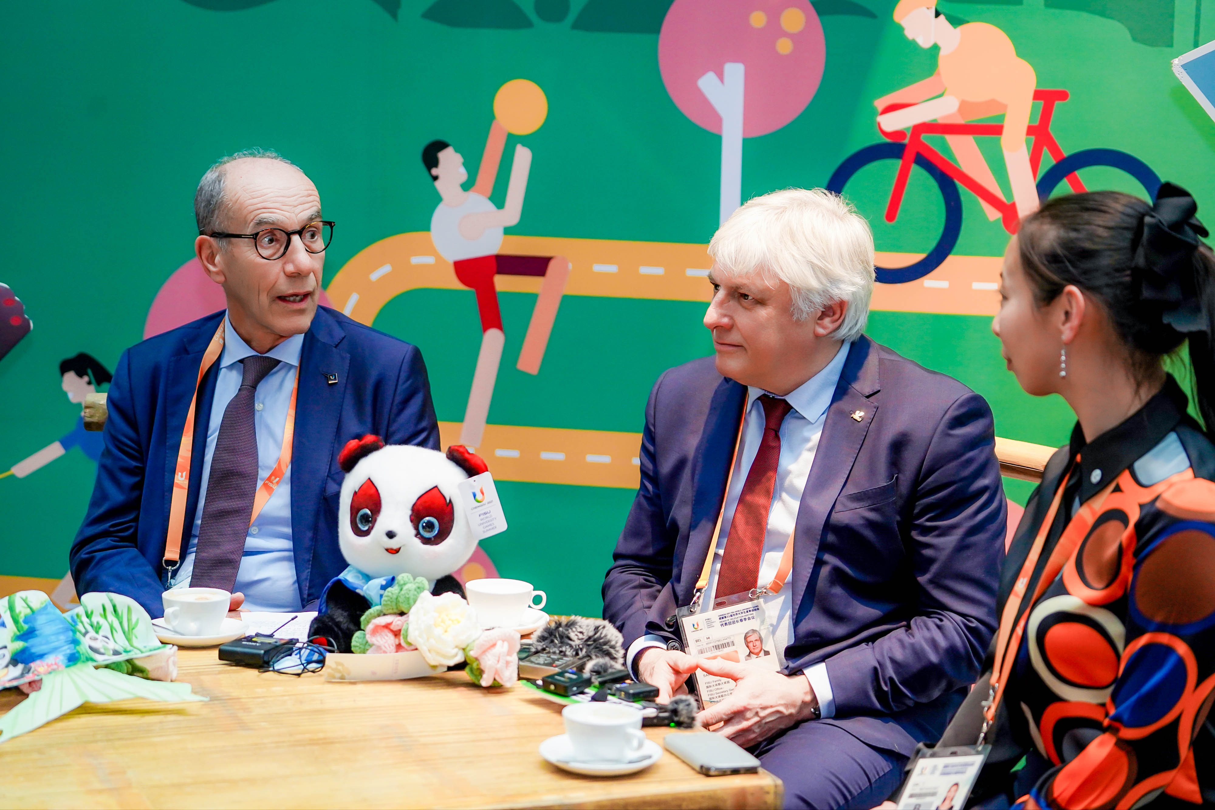 国际大体联代理主席雷诺·艾德(左)在第31届世界大学生夏季运动会代表团团长春季会议上参与交流。新华社发(成都大运会执委会供图)