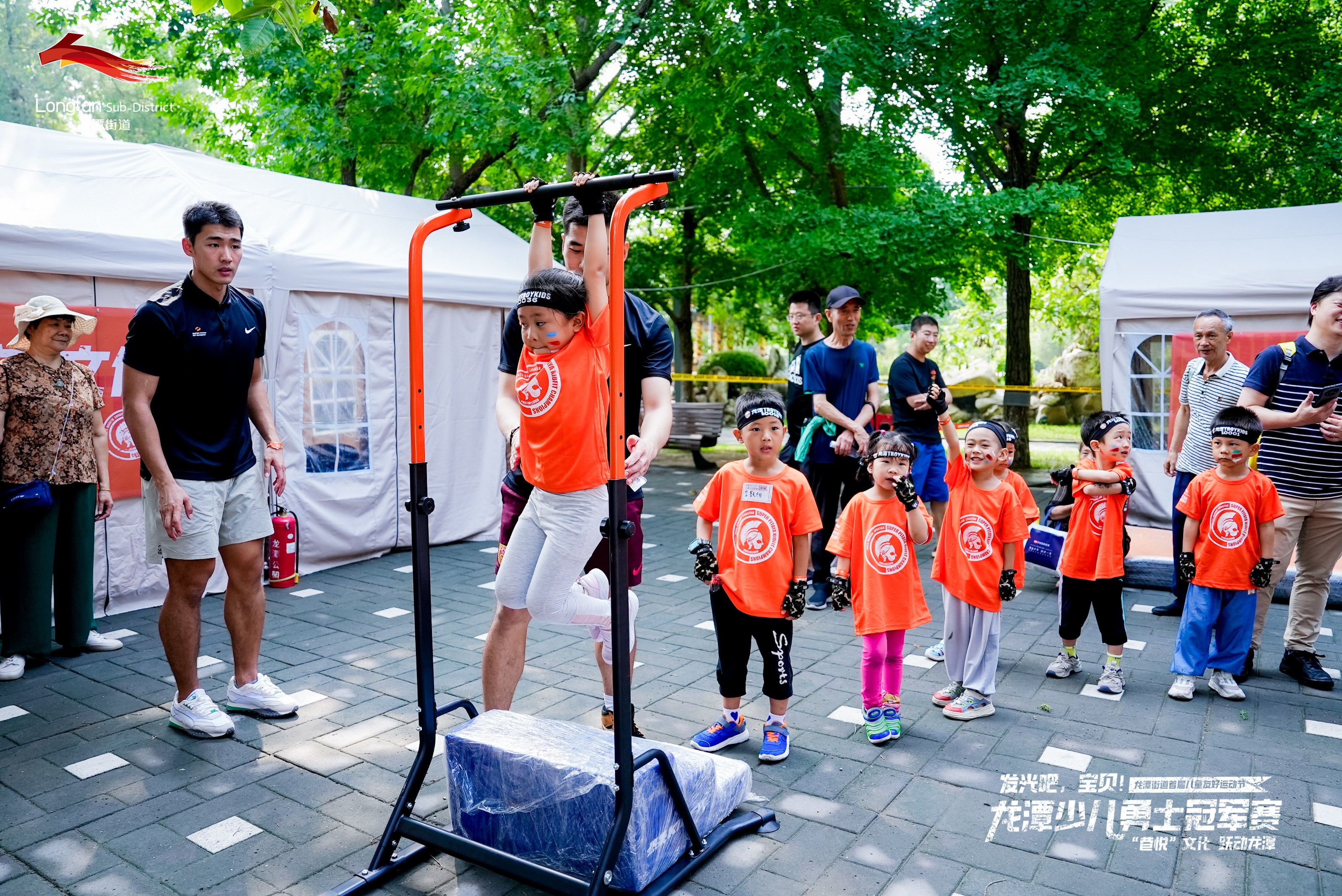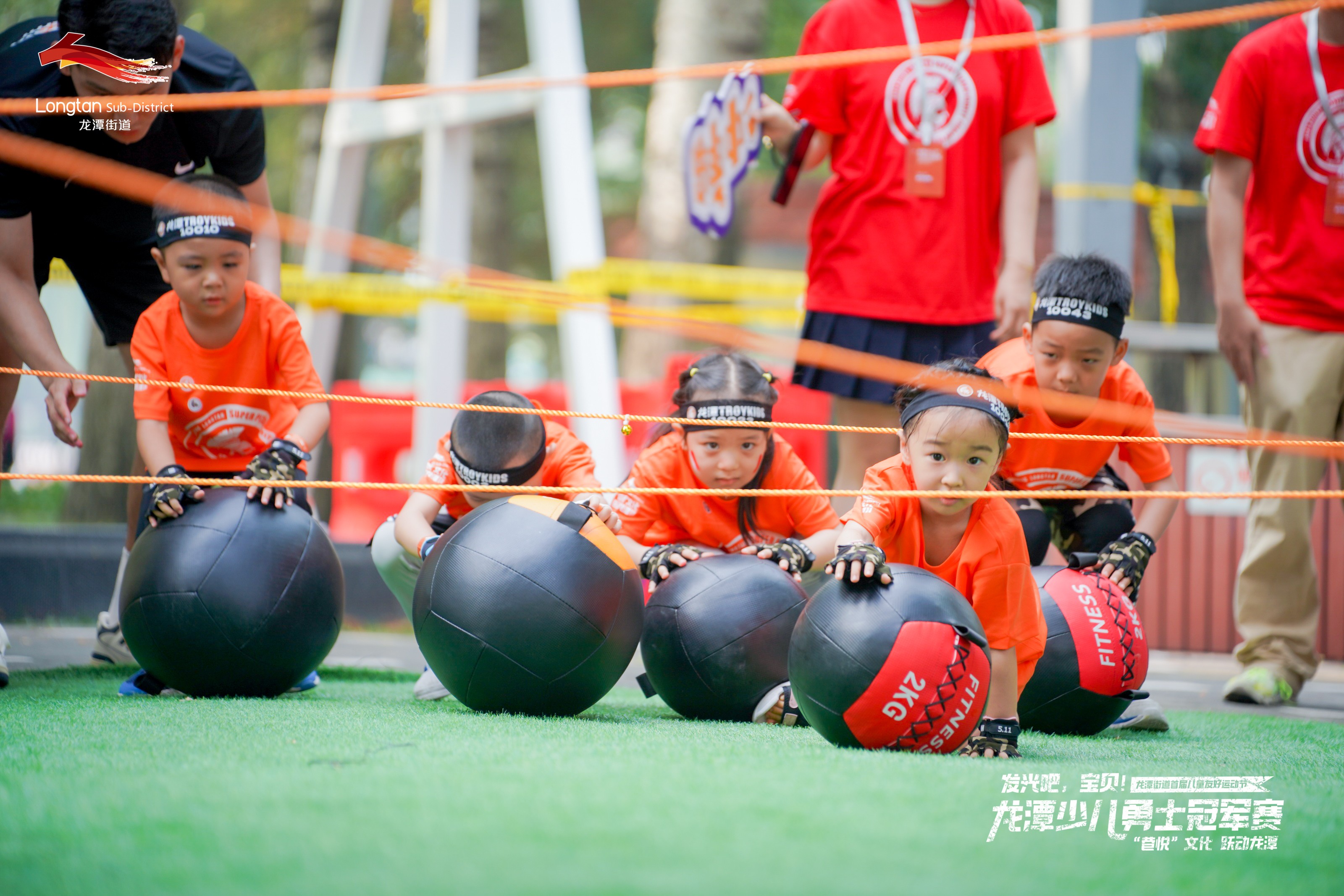 开幕式后,小朋友们迎来了期盼已久的龙潭街道首届儿童友好运动节的主题赛事——“龙潭少儿勇士冠军赛”。萌娃们身着统一耀眼的橙色“战袍”,充满热情和活力,高呼“为荣耀而战”的口号,由国家健将级运动员带队,以组团夺宝方式,向场上摆放的二十多个障碍关卡发起体能挑战,开始了一场自由无畏的成长冒险。