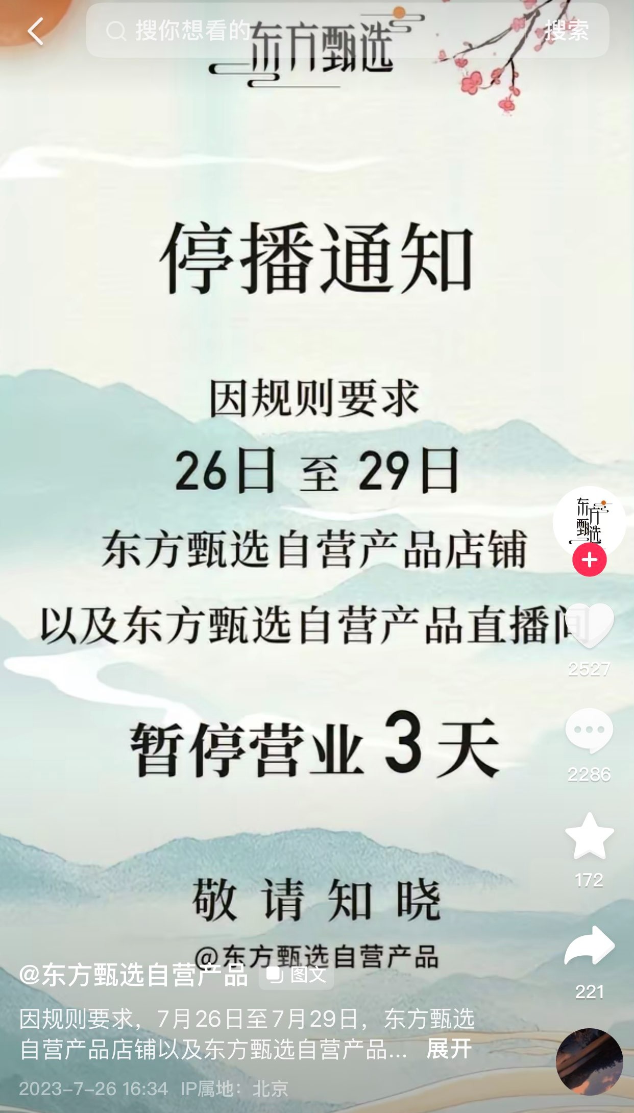 据悉,此次东方甄选受影响的店铺为品牌抖音平台自营产品店铺、自营产品直播间,这是东方甄选在抖音的官方店铺之一。包括东方甄选美丽生活、东方甄选看世界、东方甄选之图书、东方甄选将进酒等在内的其他官方账号未受影响。