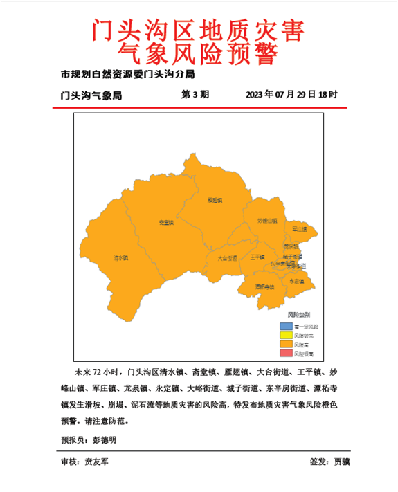 7月29日18时,北京市规划和自然资源委员会门头沟分局会同门头沟区气象局联合发布地质灾害气象风险橙色预警:7月29日夜间至8月1日夜间,门头沟区发生强降水诱发的崩塌、滑坡、泥石流、塌陷等地质灾害风险高。
