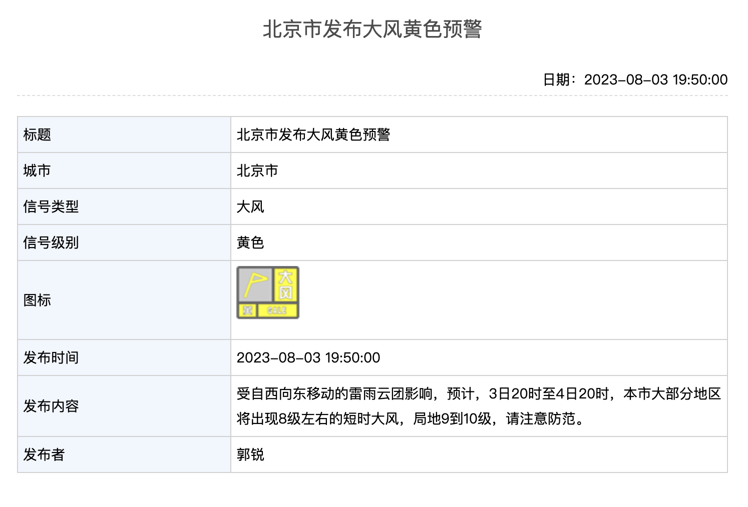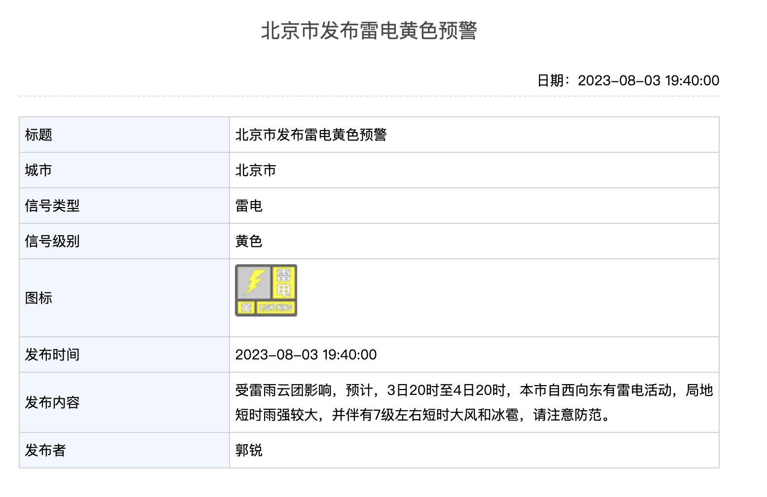 北京市气象台8月3日18时发布分区域暴雨黄色预警信号,预计8月4日03时至20时,门头沟、延庆、昌平、房山、海淀、丰台、石景山、怀柔、密云、顺义、平谷的部分地区有小时雨强超过50毫米的短时强降雨。山区及浅山区出现强降水诱发的中小河流洪水、山洪、地质灾害等次生灾害风险较大,城市低洼地区容易出现积水,请注意防范。