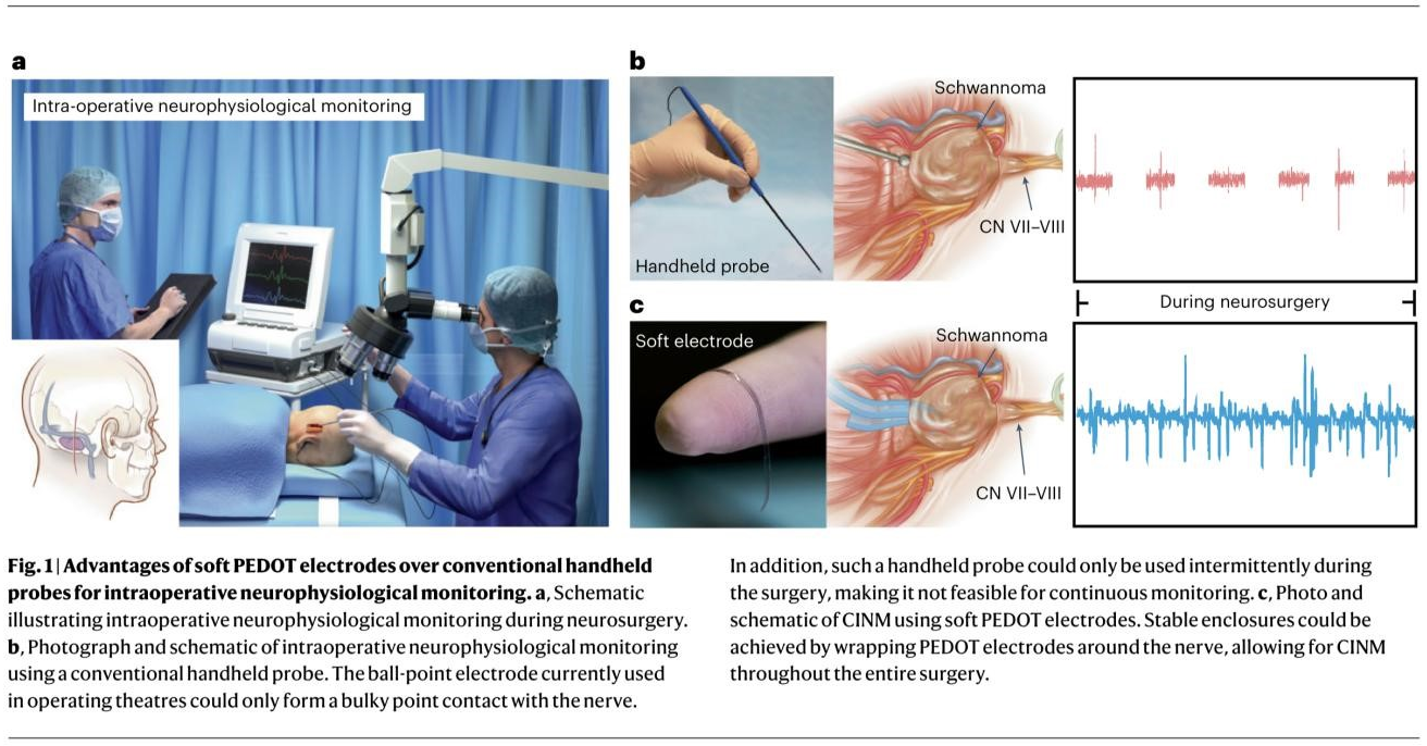研究团队针对现有神经电生理监测无法实时监测听力导致颅脑术后听力保留率极低的临床问题,创新性地采用导电高分子有机聚合物研发出柔性、可拉伸的轨道状电极,更好地与神经组织相匹配,减少机械性损伤,提高神经信号的采集质量,实现了神经电生理术中监测领域的重大突破。