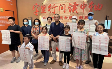 除了合影留念,小读者们最希望的,是能够拥有一张自己亲手印制的“我与中轴线”的木刻雕版图。“我与中轴线”是12年前著名学者罗哲文老先生为图书馆社会征文而题写的书名。今天,虽斯人已逝,然风采犹存,而这件文物级别的真迹也在此次展览的展品之中。在师毅老师的悉心指导下,几乎每一位参加活动的小读者都一试身手,如愿以偿地拥有了自己的杰作。他们开心地说:“这次选书与观展,收获满满,体验感十足,令人难忘。”。
