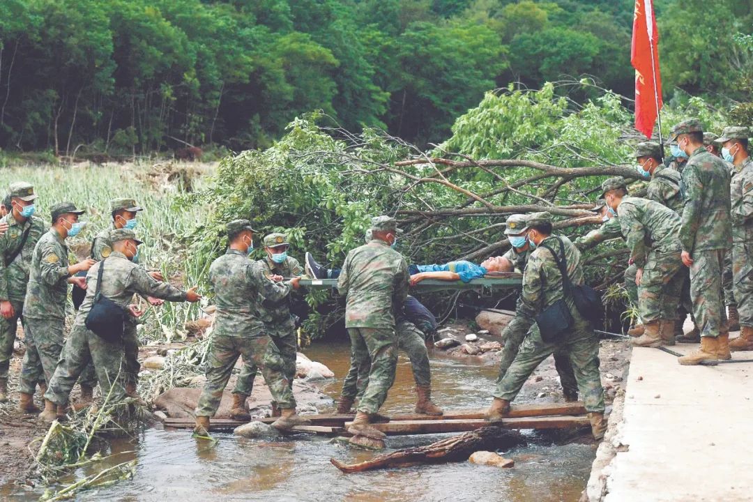 8月7日,北部战区陆军某旅官兵在吉林省舒兰市七里乡转移受伤群众。刘洋摄