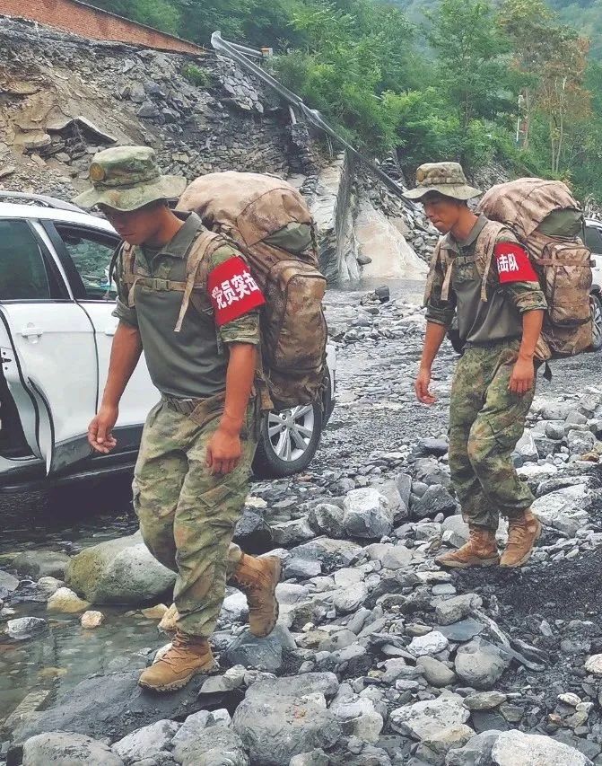 在洪涝灾区,数百名将校军官靠前指挥,广大党员冲锋在抗洪第一线,全力保障人民群众生命财产安全。保定市涞水县汤家庄村受灾后,50名民兵每人负重超25公斤,连夜跋涉在泥泞山路上,将物资全部送达。