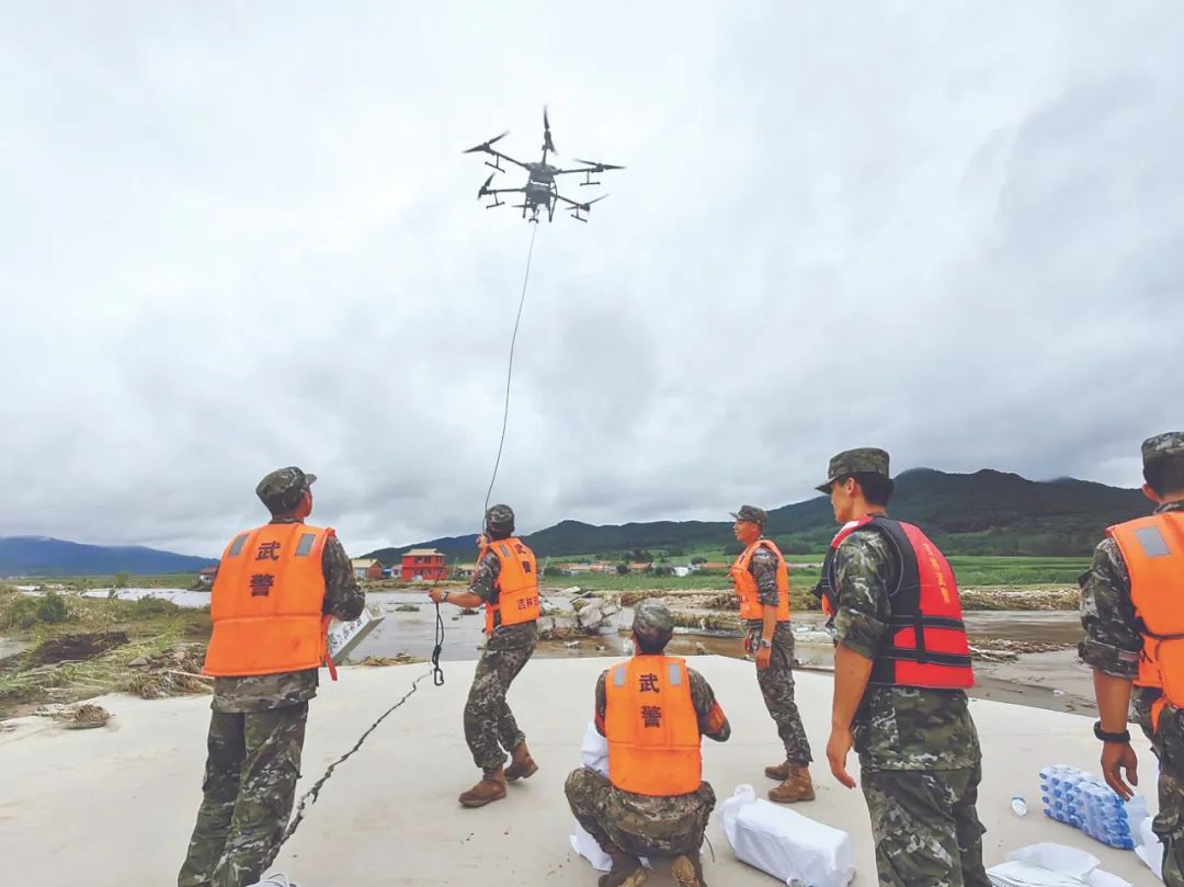 8月6日,武警吉林总队吉林支队官兵利用无人机向舒兰市开原镇五滴村小乡屯被困群众空投生活物资。李志远摄