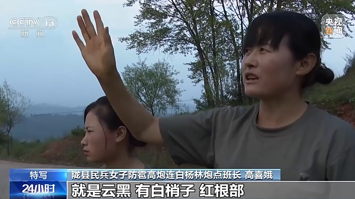 陇县民兵女子防雹高炮连白杨林炮点班长 高喜娥:要是下冰雹的那种云是疙瘩状的那种,就是云黑,有白梢子,红根部,就是有强度,它可能要下冰雹,黑云白梢子,必定有雹子。