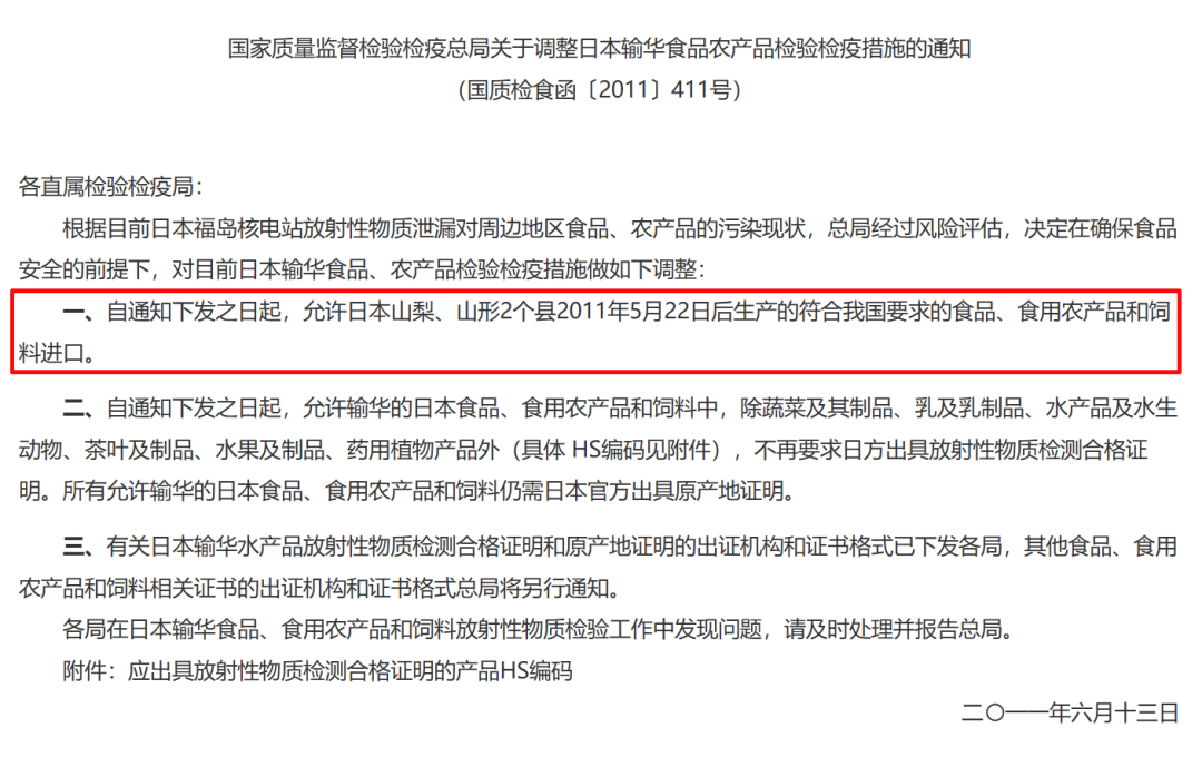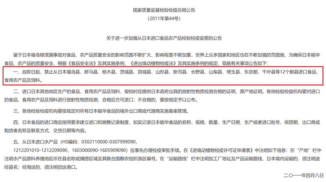 2011年,我国发布公告禁止进口日本10个都县的食品