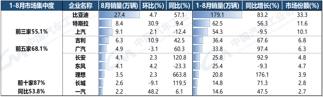 2023年1-8月,新能源汽车销量排名前十位的企业(集团)销量合计为467.5万辆,同比增长53.8%,占新能源汽车销售总量的87%,高于上年同期8.2个百分点。