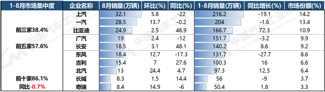 2023年1-8月,国内汽车销量排名前十位的企业(集团)销量合计为1314.5万辆,同比下降0.7%,占汽车销售总量的86.1%,低于上年同期1.9个百分点。