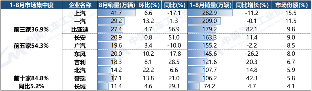 据中国汽车工业协会统计分析,2023年1-8月,汽车销量排名前十位的企业(集团)销量合计为1544.9万辆,同比增长5.2%,占汽车销售总量的84.8%,低于上年同期2.3个百分点。