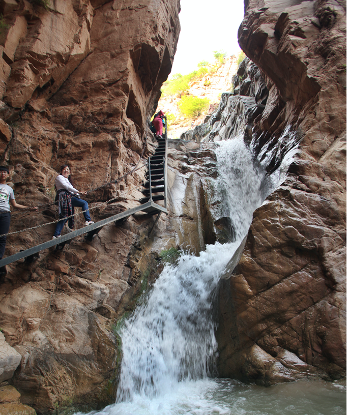 一路攀援,大大小小的瀑布、潭池迂回交错,各有美名。见心湖山影婆娑,群鱼承欢。这里是一条V型峡谷,上面开阔,下面狭窄,像合掌敞开的样子,也是华北地台的基底层。行走大约1000多米,便是水流飞溅的水帘洞。