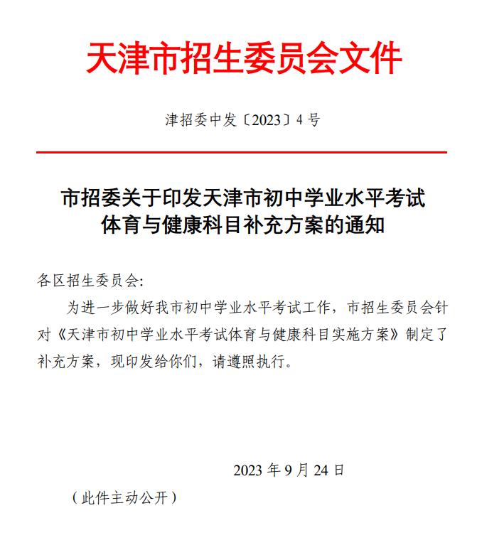 《天津市招委关于印发天津市初中学业水平考试体育与健康科目补充方案的通知》(以下简称“通知”)及《政策解读》于今日正式公布。据了解,自2024年高级中等学校招生考试开始,天津初中学业水平考试体育与健康科目“成绩评定”政策由所有学生总分值均为40分调整为有天津市学籍并参加高级中等学校招生考试的学生总分值为40分,无天津市学籍要求回津参加高级中等学校招生考试的学生总分值为22分。