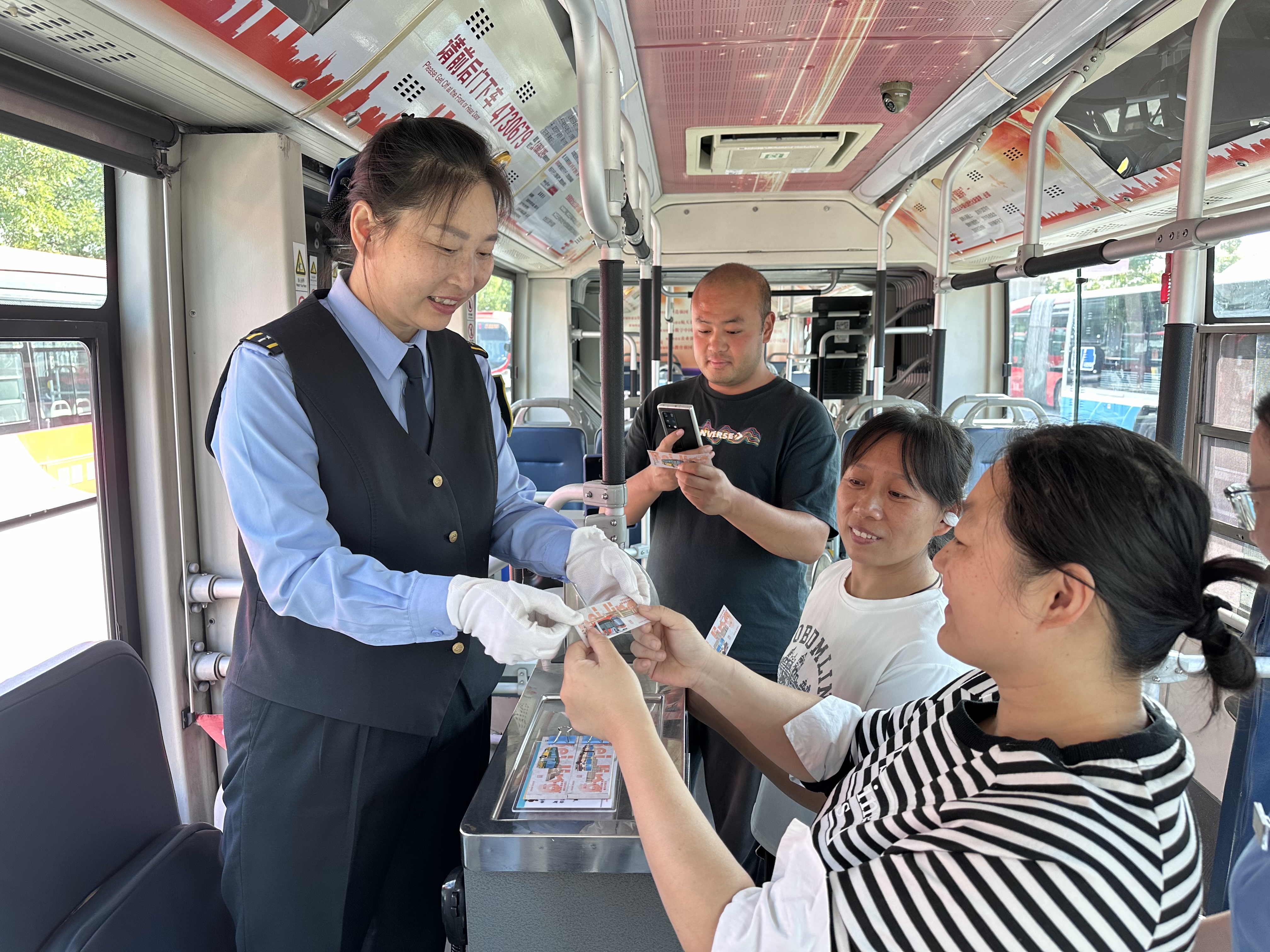 2023年9月29日,中秋节当天,1路乘务员满心欢喜地戴着白手套,拿着新印制的特色车票,走进即将发出的1路公交车里。随着公交车从老山公交场站驶出,上新的四版面值2元的无人售特色车票正式跟广大乘客“见面”了。