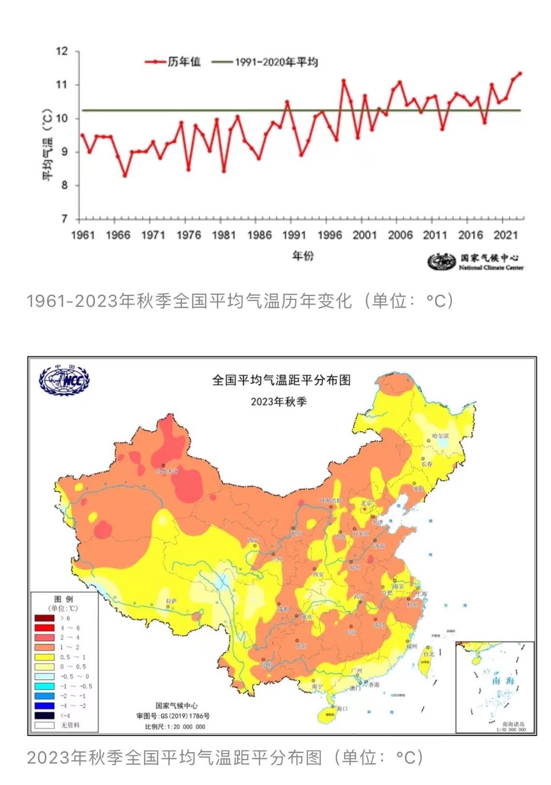 国家气候中心介绍,今年秋季(9至11月),全国平均气温11.3℃,比常年同期偏高1.1℃,为1961年以来历史同期最高。全国大部地区气温偏高0.5至2℃,其中新疆北部和东部等地偏高2至4℃。贵州、辽宁、四川、天津、新疆、云南、浙江平均气温均为1961年以来历史同期最高,甘肃、河南、山东为次高。