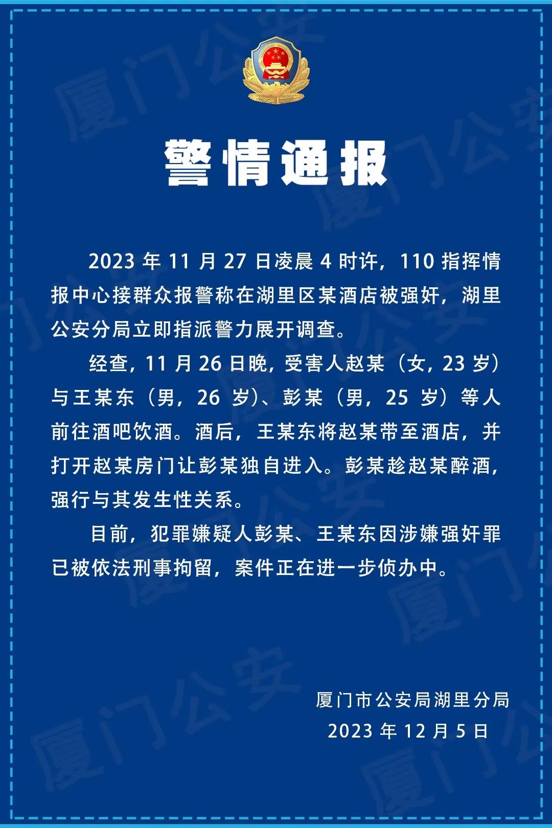 厦门警方通报一起强奸案:两名男子被刑事拘留