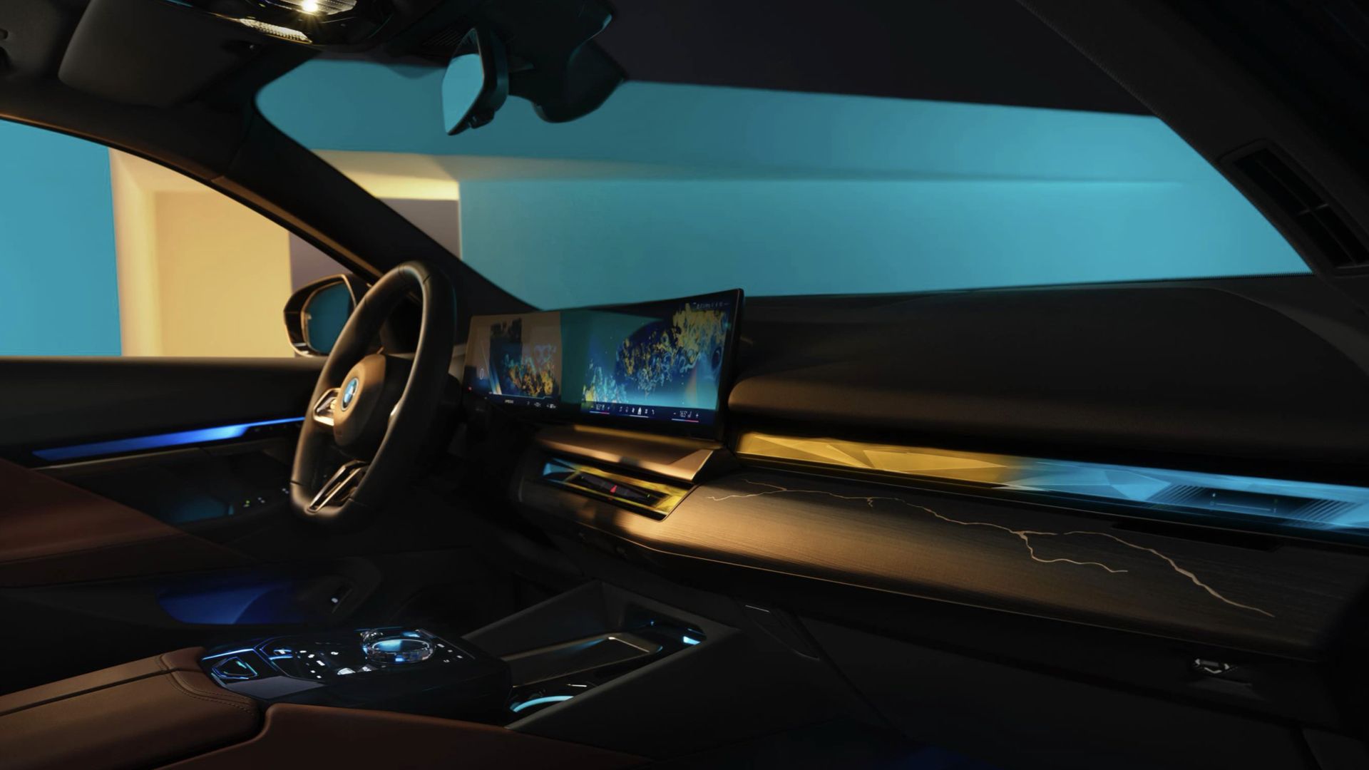 全新BMW 5系的内饰风格与智能豪华程度均沿袭了旗舰7系的顶级水准。一体式悬浮曲面屏、环抱式交互光带、璀璨水晶质感内饰三者在前排交相辉映,勾勒出层级丰富、色彩万千的视觉体验。其中,环抱式交互光带采用创新的9层结构和单透光膜,呈现出璀璨的流光效果,并通过特殊涂层实现微痕自修复,保证长期使用效果。全景星轨天幕从前排头顶一直延伸至后排头顶,可视面积比上代车型的天窗增加约30 %,星轨色彩与环抱式交互光带遥相呼应。