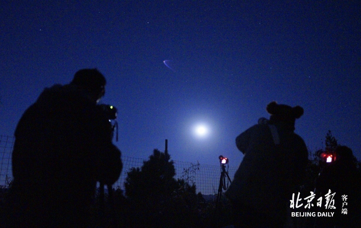 10月31日23:55,神舟二十一号飞船过境北京,在月亮上方掠过,众多航天与摄影爱好者在北京各地守候神舟飞船。